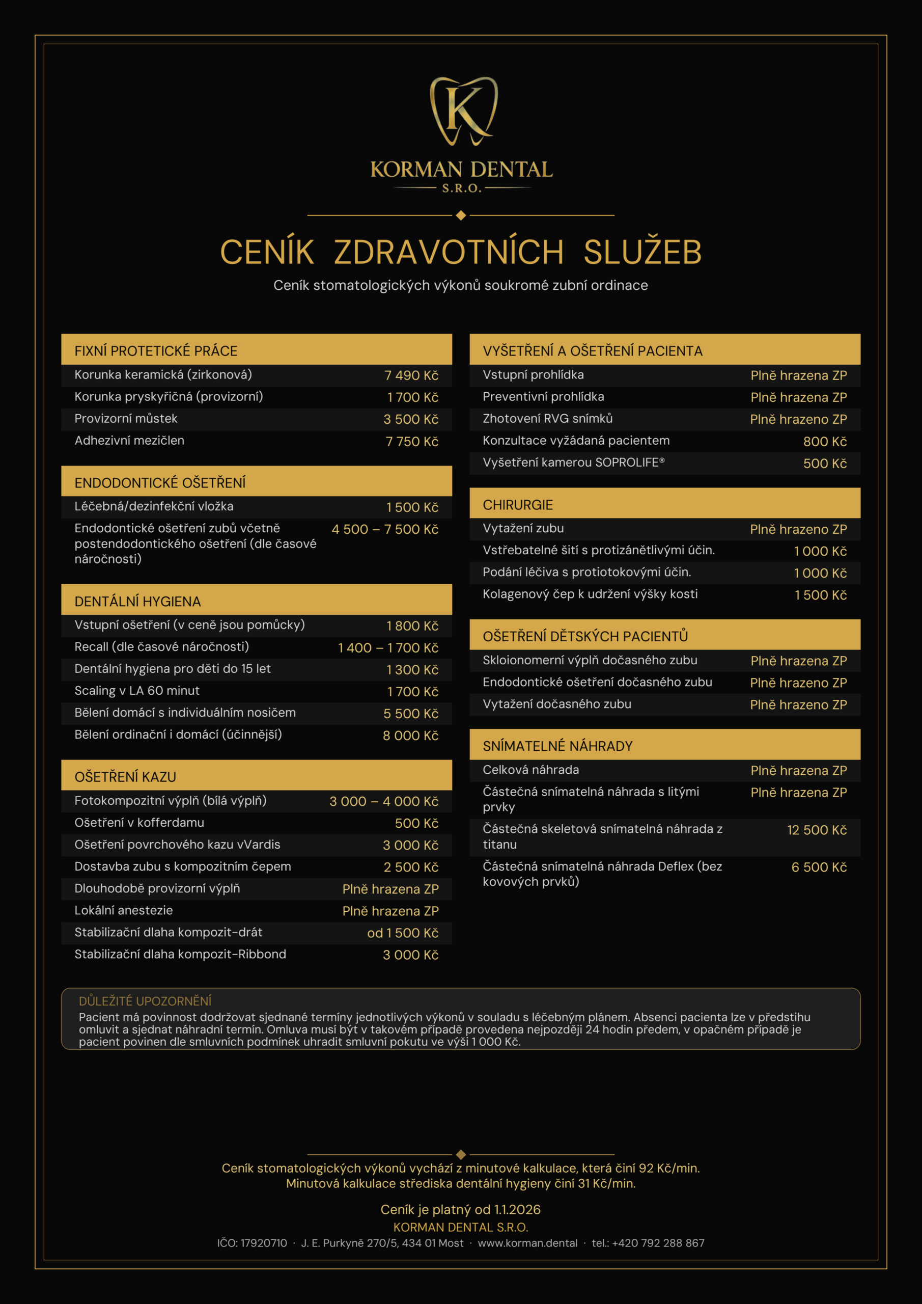 Vážení pacienti, z důvodu přípravy Dr. Kormana na atestaci z parodontologie může být část pacientů ošetřena kolegy – lékaři Korman dental. Postupy i ceny zůstávají stejné, péče probíhá pod odborným vedením Dr. Kormana. Děkujeme za pochopení.